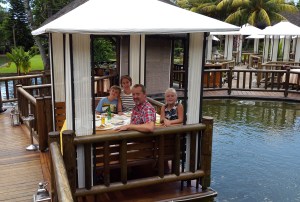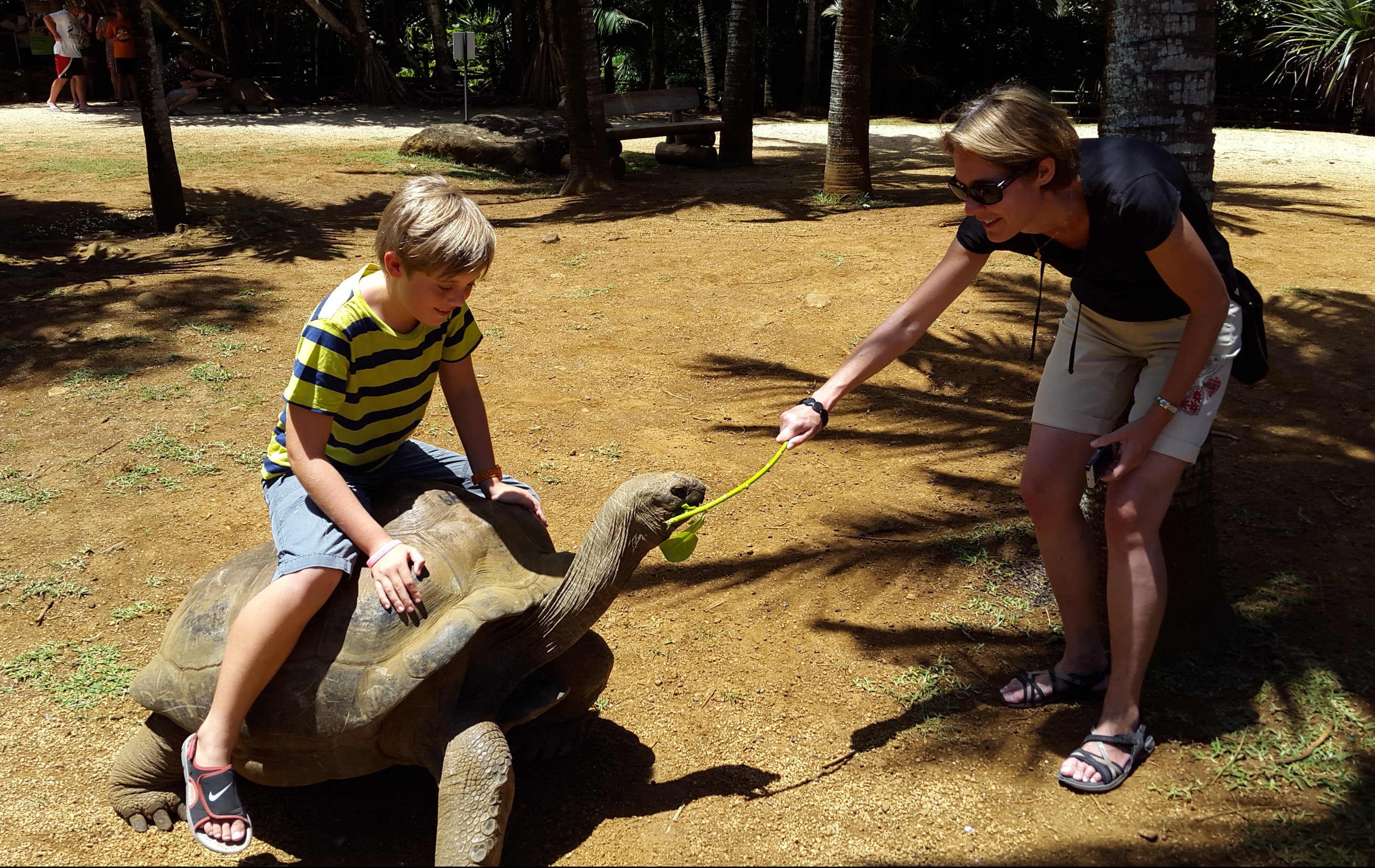 Flera dagar gjorde vi som sagt utflykter med vår bil. Första gången var till ett djurreservat längst ner på öns södra del som heter La Vanille. Där fanns det lite apor, krokodiler och ödlor, men största publikmagneten där var den stora mängden jättesköldpaddor, några uppemot 150 år gamla. Barnen fick gärna rida på de största exemplaren. På tillbakavägen tog vi en naturskön väg genom nationalparken Black River Gorges där vi stannade vid några vackra högt belägna utkiksplatser.