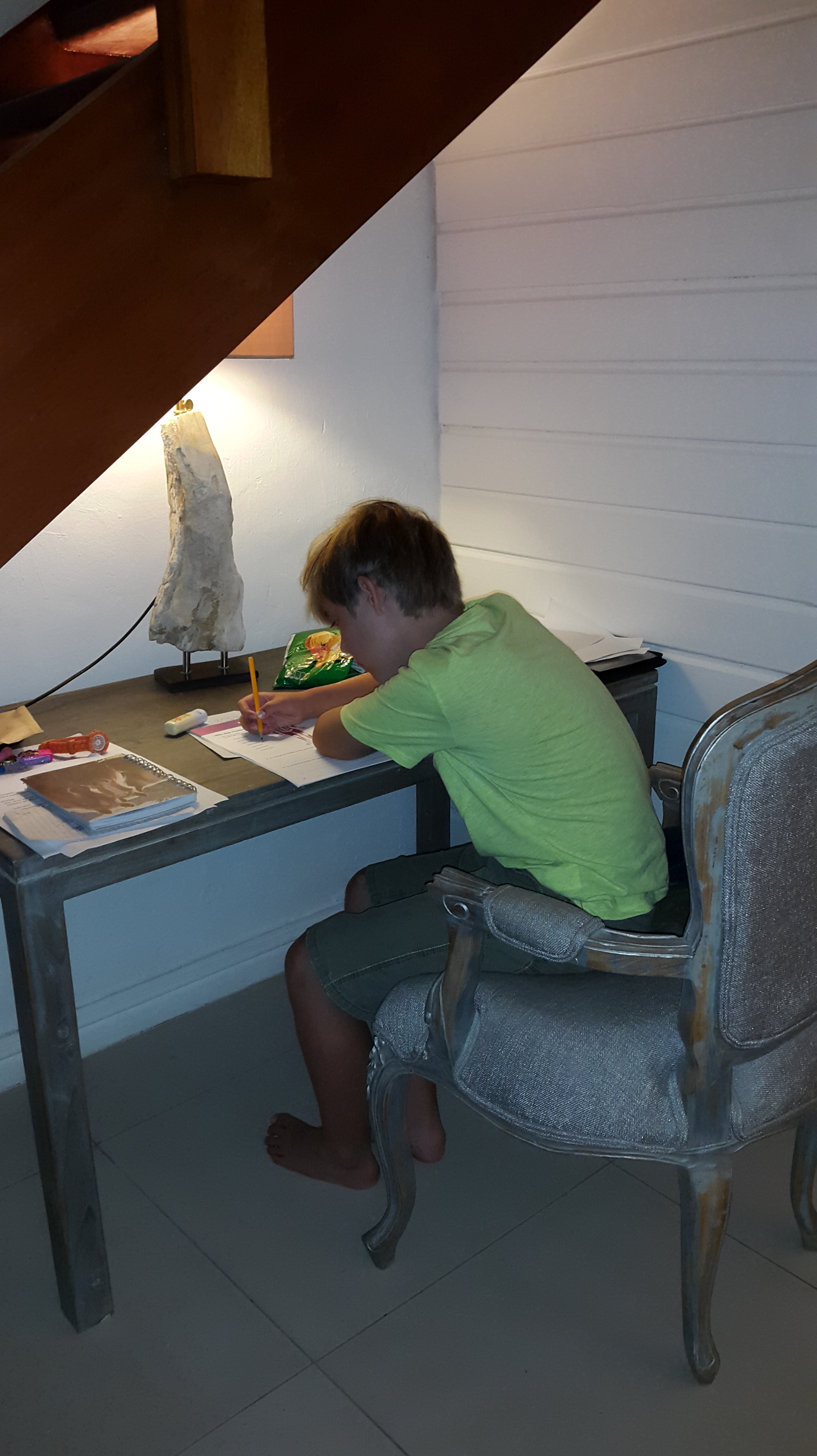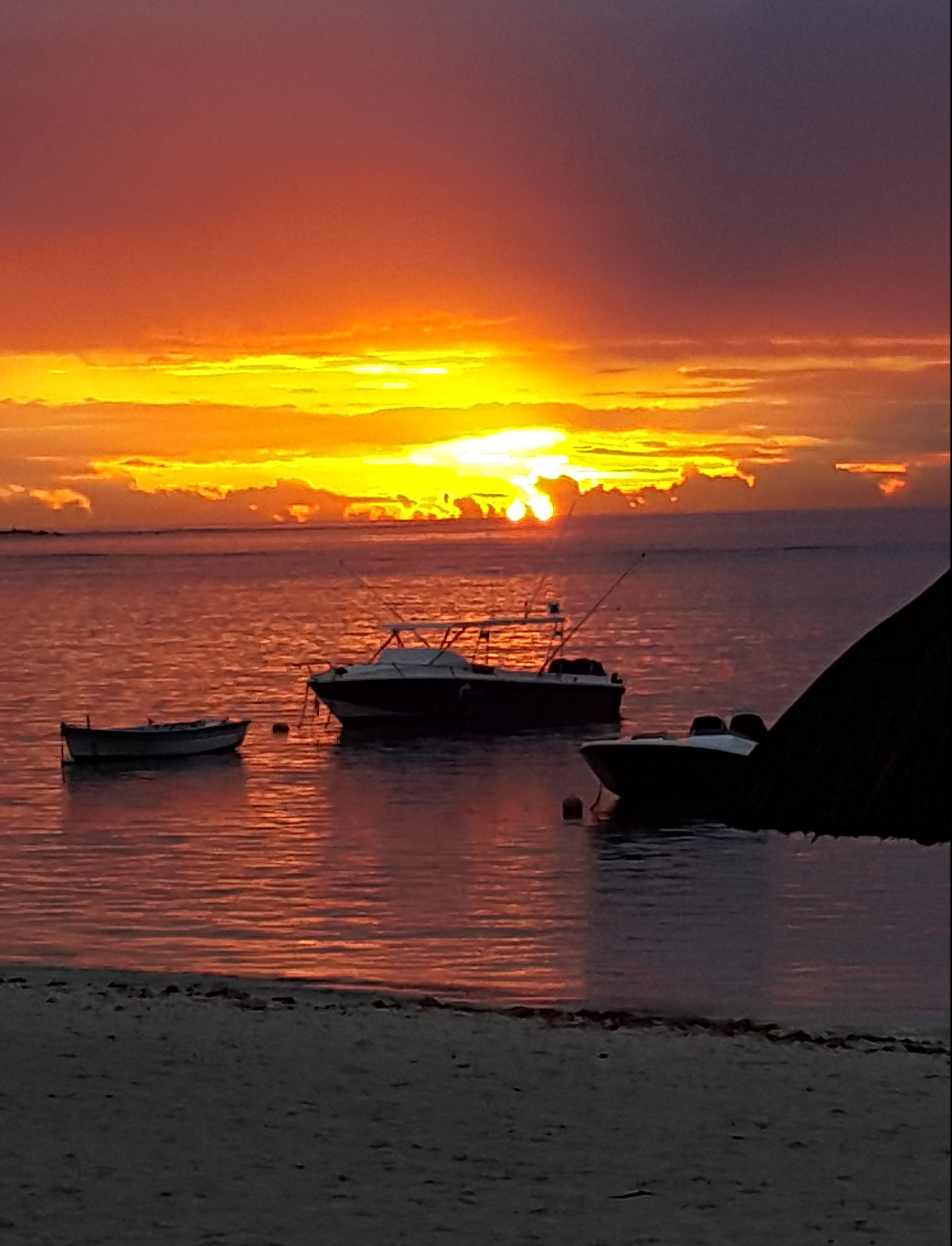 Så här års (sent i januari) är det regn- och cyklonsäsong, men temperaturen ligger konstant på runt 30 grader och solen strålar för det mesta. Vi hade kraftigt regn en eftermiddag, och lättare skurar ett par andra dagar. De dagar vi stannade på hotellet kunde vi paddla kajak när vi inte badade. En gång åkte vi ut med en båt med glasbotten som man såg koraller och fisk genom. Vi la sen till vid ett korallrev ett par hundra meter ut från stranden där vi snorklade bland fiskar i alla regnbågens färger, som inte tvekade att nappa åt sig av bröd vi hade med oss för att mata med. En otrolig upplevelse! I Maputo, där har vi havsutsikt åt öster, får vi inte får se några solnedgångar. Eftersom vi nu befann oss på Mauritius västkust fick vi i princip varje kväll runt 18:50 se spektakulära scenerier när solen snabbt (”blink and you’ll miss it”) sjönk nedanför horisonten… speciellt de dagar när det hade regnat.