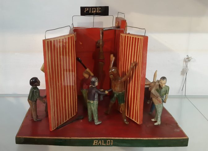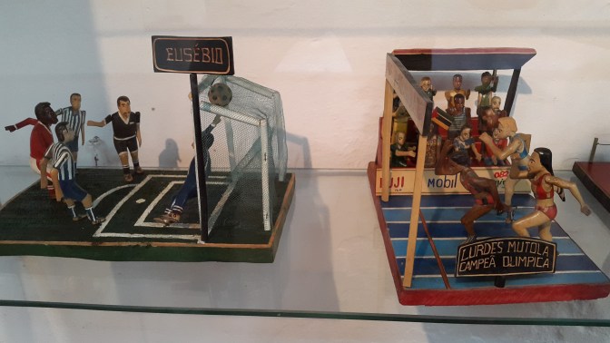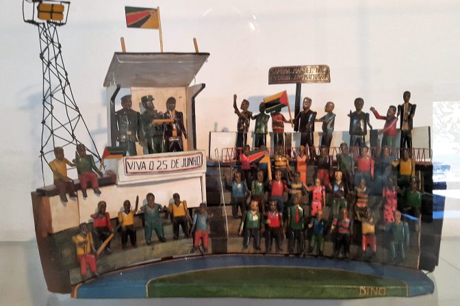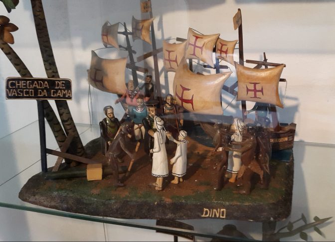Anledningen till vårt senaste besök på fästningen är att där pågår en intressant utställning av modeller som skildrar landets historia, från Vasco da Gamas ankomst fram till våra dagar. Konstformen kallas för Psikhelekedana, som jag inte har en aning om vad det betyder, men det är väldigt populärt här. På marknaderna här kan man köpa sådana modeller som skildrar vardagslivet (gatuförsäljare, bussköer, läkarmottagningar, klassrum, mm). De är dock efterapningar, om än fina sådana. Originalen kommer från en grupp av fyra konstnärer, varav en, Dino Jethá, hade en egen utställning nyligen som jag skrev om i ett annat inlägg. Här följer lite exempel på några av de många modeller som vi kunde beskåda: