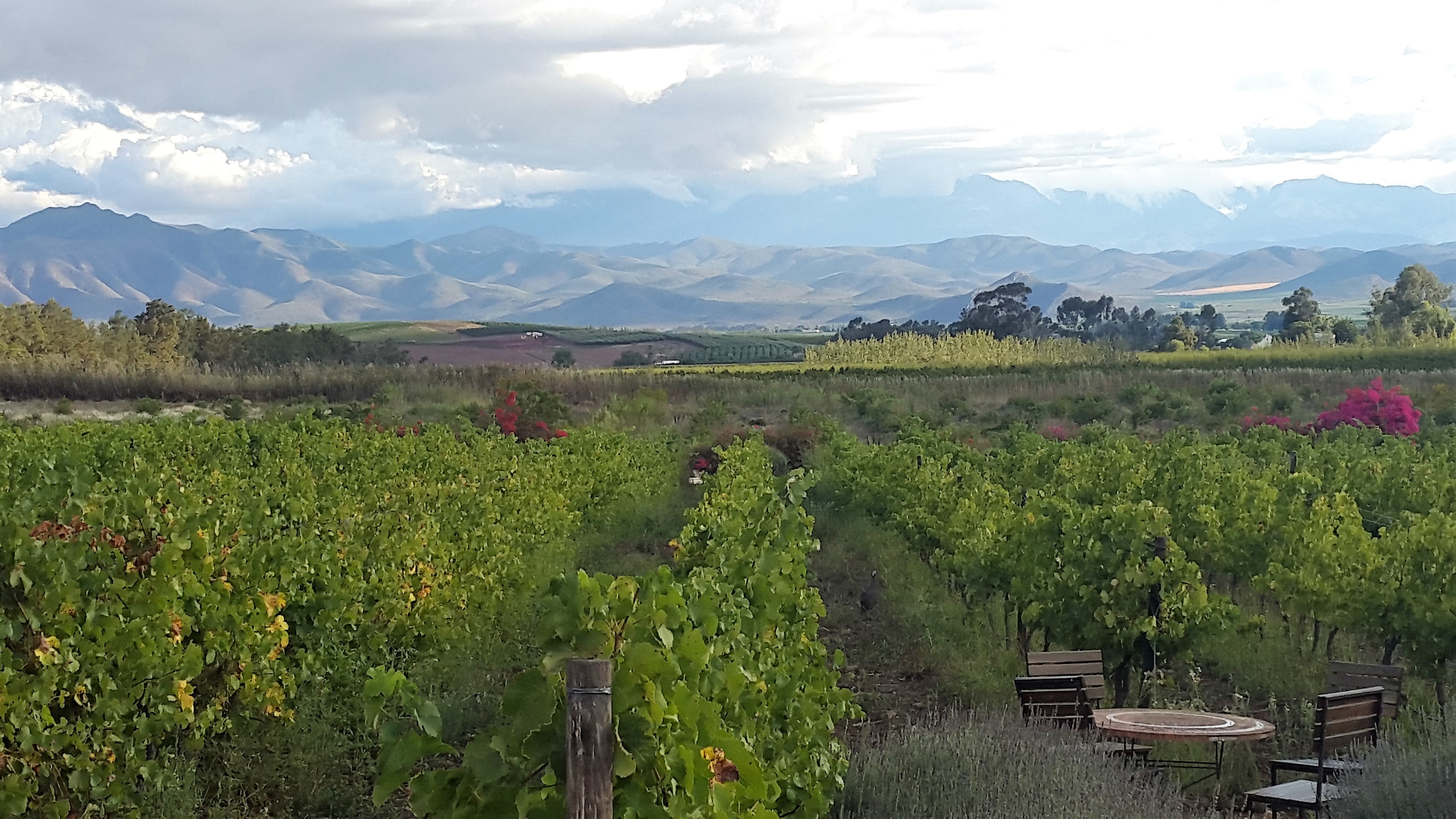 Oudtshoorn, som vi bodde utanför en natt, är även centrum för landets strutsfarmande. Och mycket riktigt, stället vi bodde på, Mooiplaas Guesthouse, hade sina egna strutsar och ägarfamiljen hade till och med en hel farm i närheten där vi hängde med på en guidad rundtur och fick lära oss allt om dessa djur och de produkter de ger. Vi gasade sen vidare längs Väg 62, oftast med berg i fonden, och ibland fick vi passera igenom dem längs vindlande passager. Ju längre västerut vi kom, desto tätare låg vinodlingarna längs bergssluttningarna. Det är dock inte så vanligt att vingårdarna erbjuder natthärbärge, men vi hade iallafall hittat en där vi kunde bo: en ”boutique-gård” med det poetiska namnet Fraai Uitzicht – ”vacker utsikt” på afrikaans/holländska. Och namnet stämde ju, utsikten var otroligt vacker åt alla håll och kanter, men stället som sådant blev en liten besvikelse med tanke på att vi betalat en smärre förmögenhet för att bo där.