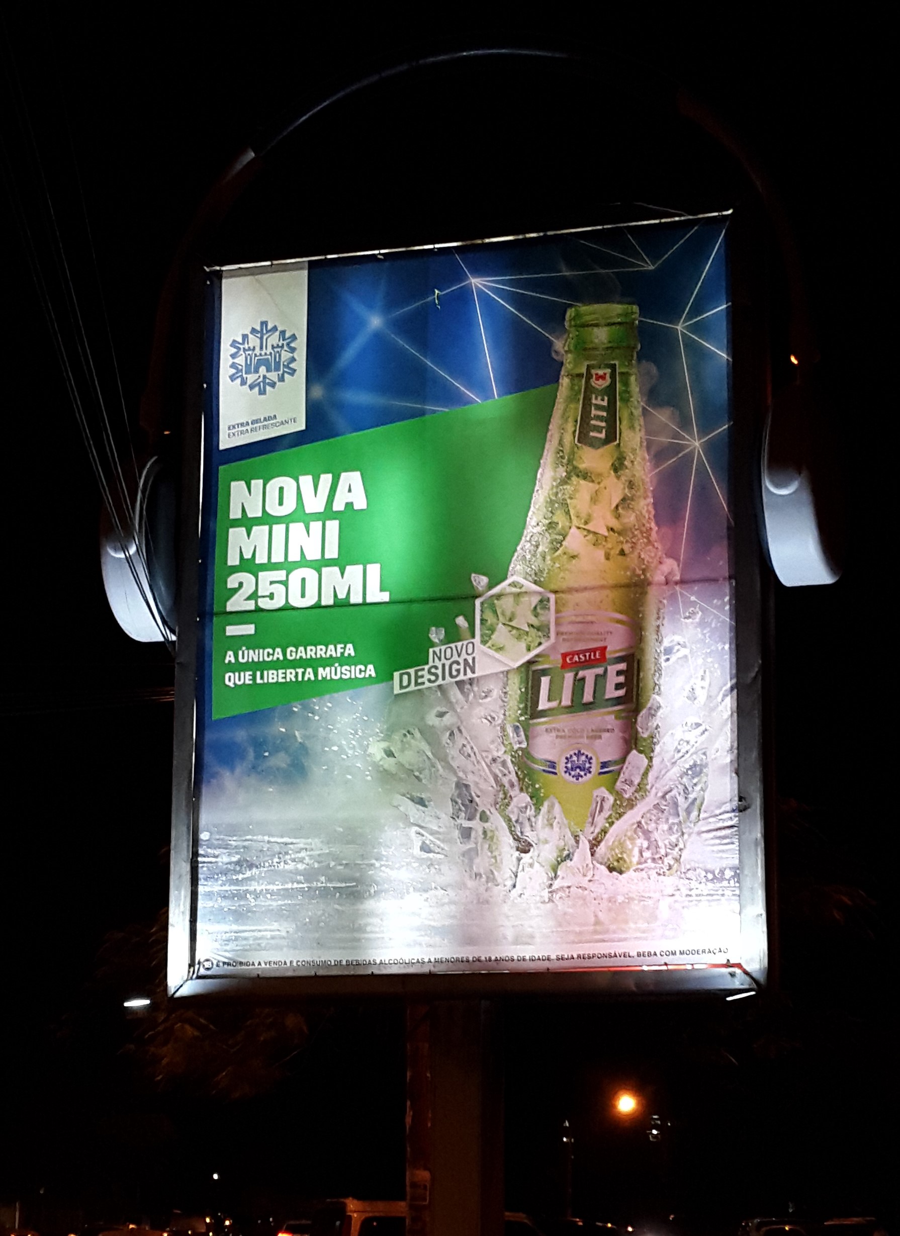 Strax efter att jag hade postat det här inlägget upptäckte jag reklamskylten här bredvid till höger. Castle Lite är ett sydafrikanskt öl som säljer stort i hemlandet och som går ganska bra här i Moçambique också. Det är alltså CDM’s direkta ägare SABMiller som tar in det. Svårt att se på den mörka bilden kanske, men det sitter ett par enorma hörlurar på reklamskylten. Ett kul grepp.