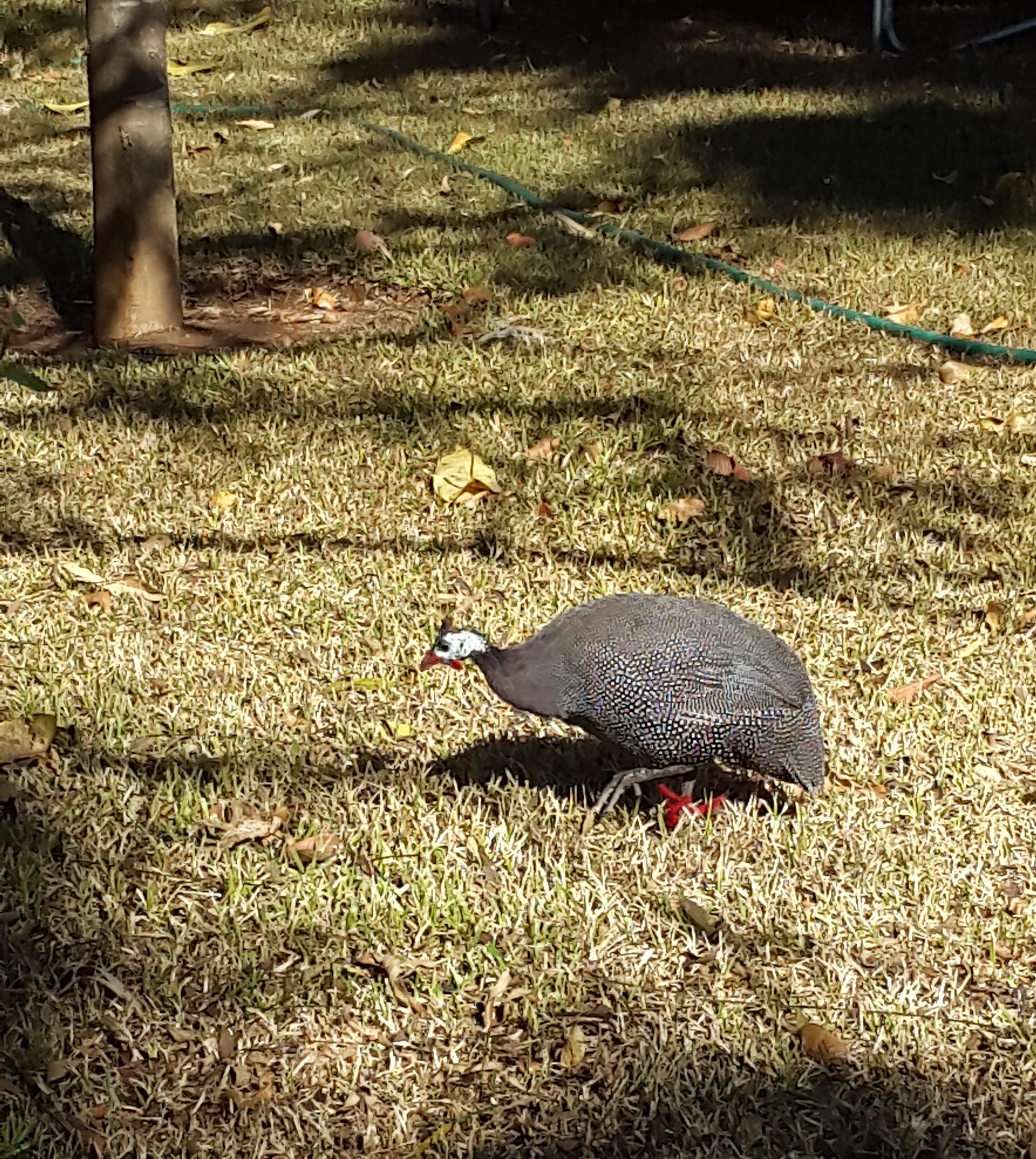 Efter dessa spända dagar var det skönt med en lugn helg. Vi var hembjudna till Karins kollega John Viner med familj på sushimiddag, trevligt värre med dart, whisky och bra musik därtill. Sen har vi ägnat mycken tid åt att styra upp trivseln i huset… en hel del konstverk har åkt upp på väggarna och myggnäten monterats över sängarna (inte för att de egentligen behövs så här års, men ändå). Vi hittade en mysig italiensk restaurang i grannskapet där vi åt söndagslunch. Eller egentligen inte italiensk utan en italiensk-zambisk crossover. Jag fick i alla fall en rejäl balja med spaghetti och köttbullar – en riktig ”Lady & Lufsen”-portion. Goda små bakverk hade de också så det lär bli fler besök. Sen har vi upptäckt att vi fått ett nytt ”husdjur”. Det är ett rätt härligt fågelliv häromkring. Flera tuppar i området gal lite när som helst på dygnet. Från vår granne, den franska ambassaden, hörs regelbundet en påfågels klagande läte. Ett par gånger har vi sett en liten uggla längs vår garageinfart, som ibland hoar på nätterna. Nu är det senaste ornitologiska tillskottet en pärlhöna som sedan igår spatserar omkring på vår tomt och pickar i sig av… ja, vad nu pärlhönor äter? Den verkar trivas här och är inte allt för skygg av sig. Som kan skymtas på bilden nedanför sitter det fast ett rött snöre på ena benet. Det kan kanske vara någon slags märkning, men jag lutar mer mot att det är något den trasslat in sig i. Trist, men den verkar inte hämmas av det i alla fall.