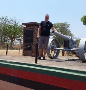 En av dagarna gjorde jag dessutom en utfärd på egen hand, som jag så småningom tänker mig att utveckla till ett separat blogginlägg. Det handlar om Zambias öde under första världskriget, som kan sägas ha utgjort den koloniala erans sista suck. Då framför allt Tyskland tog kriget som förevändning för att försöka utöka sina afrikanska territorier. Man hade Tyska Östafrika (dagens Tanzania, Rwanda och Burundi). Man hade Tyska Sydvästafrika (dagens Namibia). Vad ligger däremellan? Precis, Nord-Rhodesia/Zambia! Genom att erövra Zambia hade tyskarna kunnat slå en bro över hela kontinenten. Nu gick det dock inte så. Med gemensamma krafter kunde engelska, belgiska och till viss del portugisiska trupper stå emot de tyska ambitionerna. Uppe i nordöstra hörnet av Zambia, i gränstrakterna till Kongo, Tanzania och Malawi, fajtades det friskt. I viss mån spillde det över i norra Moçambique också. När det blev vapenvila den 11:e november 1918 visste man inget om det på den här fronten. Först tre dagar senare nåddes den tyske generalen von Lettow-Vorbeck av ett telegram som informerade om Tysklands kapitulation. Platsen där han mottog meddelandet visade sig ligga ”bara” nio mil (längs skumpiga vägar) från Kapishya, och där finns idag ett litet monument som jag gärna ville se. Och det fick jag!