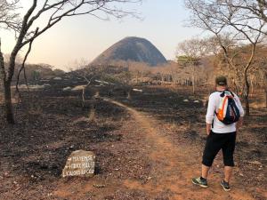 Dag två hade jag och John bestämt oss för att göra en vandring i arla morgonstund till den högsta toppen i området, Mayense, som tar en upp på närmare 1700 möh. Det tog faktiskt bara en timme, dock med rätt brant klättrande sista biten, och belöningen var en fenomenal utsikt trots morgondiset. Som synes på bilderna bredvid och längst upp var det väldigt svartbränt i naturen. Området hade haft flera skogsbränder på sista tiden; några som startat av sig själv, och några som startats av tjuvjägare för att driva djuren (småvilt och antiloper). Det gav en ogästvänlig, nästan spöklik känsla. Vi var häromåret på Nya Zeeland och besökte då platserna som föreställde det ”mörka riket” Mordor i Sagan om ringen-filmerna, och detta låg inte långt efter i ödslighet. Men ge det ett litet tag och det kommer explodera i grönt när regnen snart kommer.